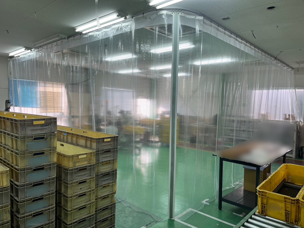 工場内の加工作業スペースの【温度管理】を目的として、間仕切りカーテン設置をご依頼いただきました。密封度を高めるため、2点の工夫を取り入れました。