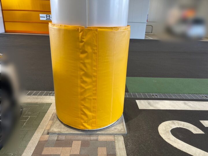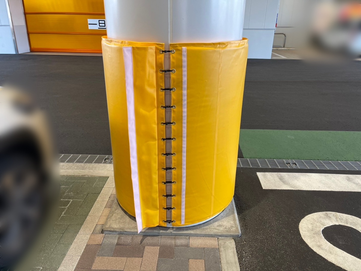 駐車場内で支柱に車がぶつかる可能性がある為 保護マット製作のご依頼をいただきました。 サイズ:φ920×H1200×ウレタン40mm 生地:ダイニック㈱ マース(イエローオレンジ)