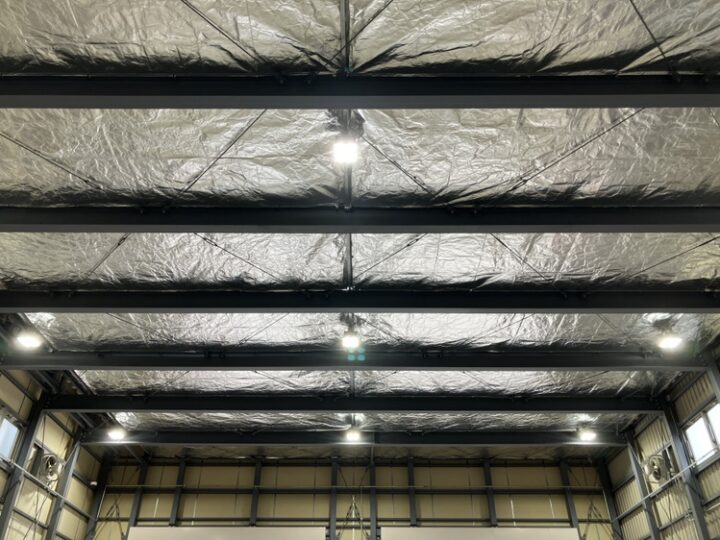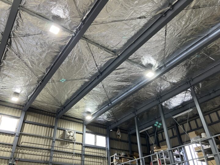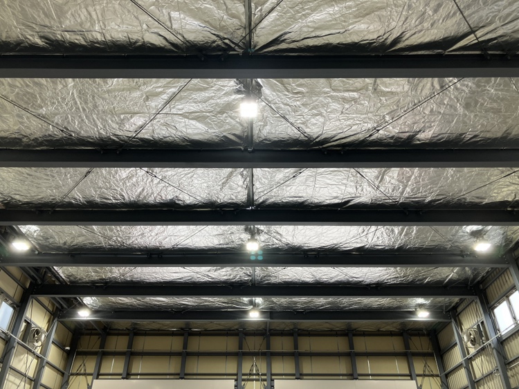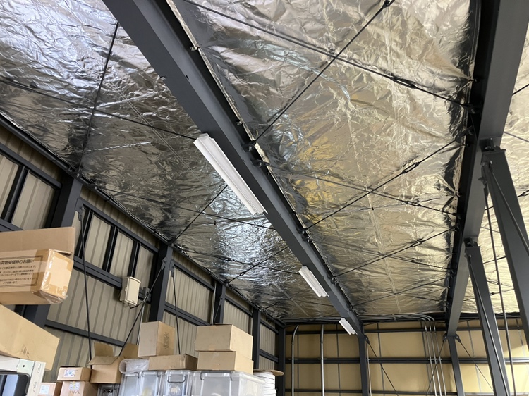 倉庫内は建屋の高さが、どうしても高い工場や施設が多いと思います。屋根裏から降り注ぐ直射日光の輻射熱を、シートを使って防ぐことで、じわじわと伝わる熱を軽減させる効果が期待できます。冬場はシートがある分、防寒対策としての効果も期待できます。