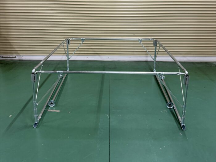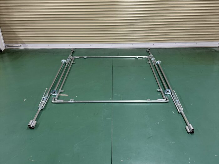 柱の中折れ部分を軽く持ち上げて折り曲げ、柱の上部にある受け穴に桁パイプを差し込みます。