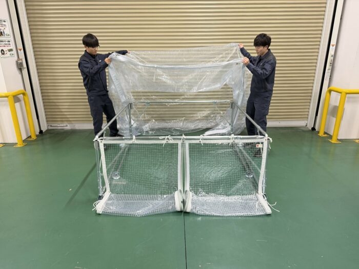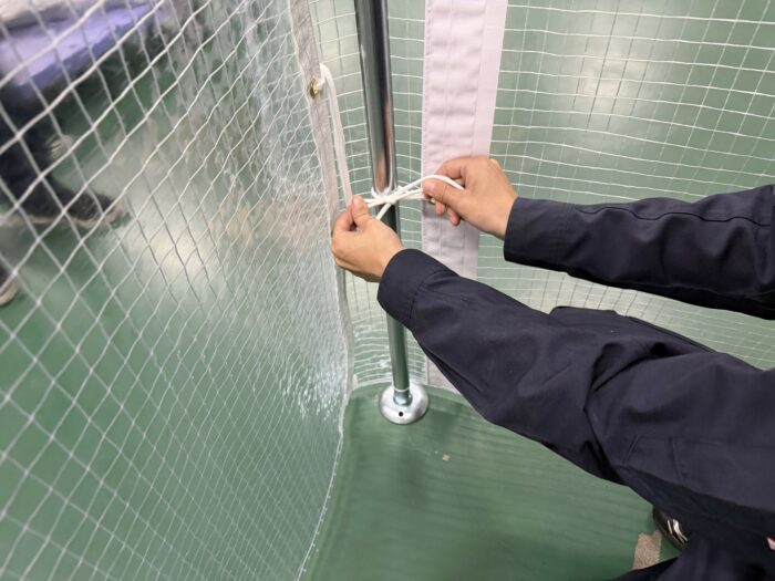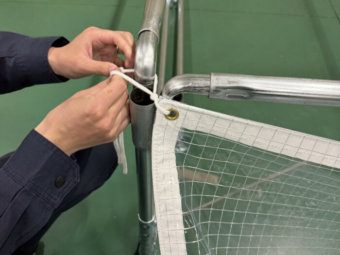 四隅の柱に、本体シートを紐でしっかりと結びつけて固定します。