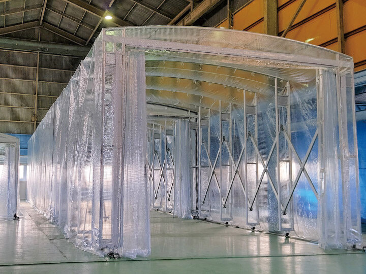 本体部分が伸縮する構造の為、必要な時に伸ばし、不要な時には縮めて収納できるテントです。キャスターを付けることで、容易な伸縮や、移動を行うことができます。パイプとシートの構造ですので、組み立て工期の短縮も見込めます。用途は塗装ブースや、簡易保管ブース、簡易作業ブースなど多岐に渡り使用されています。ジャバラ式テント、アコーディオン式テントと呼ばれることもあります。