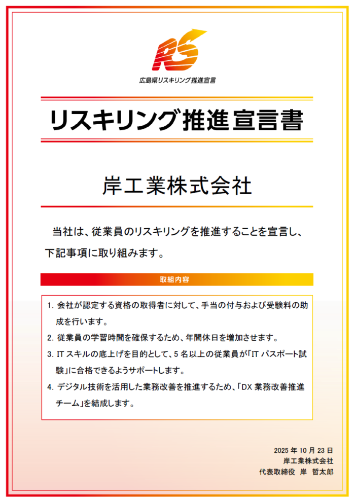 岸工業株式会社では、昨今の時代の変化に適応すべく、現在対応しているスキル以外にも新たなスキルを獲得するための支援策として「リスキリング推進宣言書」を策定しました。